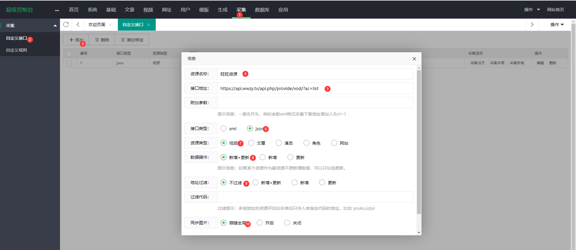 json接口地址https://api.wwzy.tv/api.php/provide/vod/?ac=list一定要使用json接口,否则采集不到扩展分类1、打开网站后台2、点击(顶部)采集3、点击